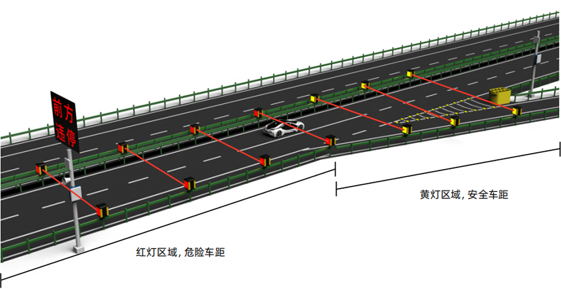 When no vehicles pass by, the yellow induction light of the induction device flashes synchronously, and the red warning light is turned off; When the radar detects the passing of a vehicle, it triggers the red warning light of the upstream specific group induction device to light up, forming a red wake to alert the following vehicle: there is a vehicle ahead and the safe driving distance for following vehicles. At this time, the yellow induction lights of other induction devices flash synchronously. When the vehicle passes through the next set of induction devices, the red wake will move forward synchronously with the vehicle's dynamics.