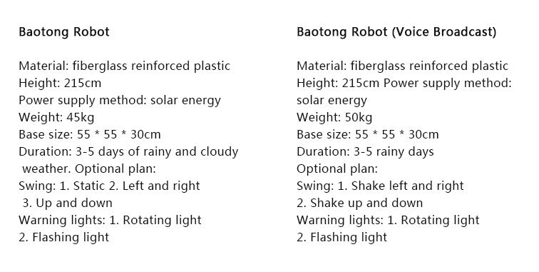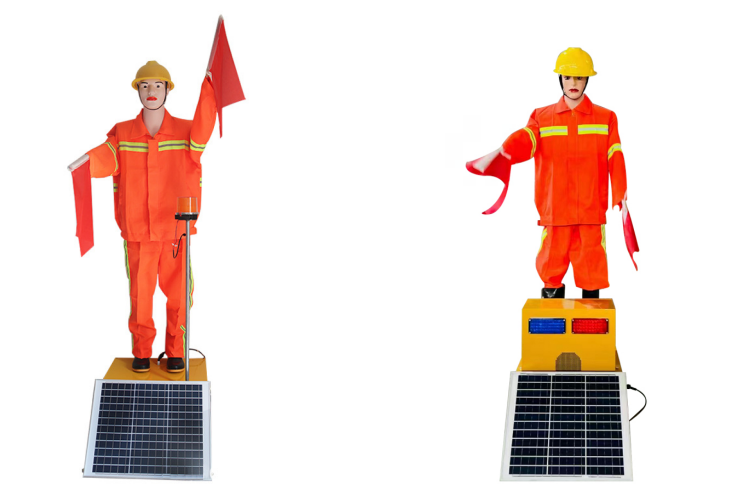 The solar powered communication robot includes a base and a plastic body. The plastic body is equipped with a driving structure, which includes a bracket, a driving motor, a cam, a slider, a pair of connecting rods, a pair of mounting blocks, and a pair of rotating rods; The bottom of a pair of connecting rods is connected to the top of the slider, and the top is rotatably connected to a pair of mounting blocks, which are fixed to a pair of rotating rods; A pair of rotating rods are respectively connected to the bracket for rotation, and two arms are respectively connected to the outer ends of the pair of rotating rods. The driving motor is installed on the bracket, and the bracket is equipped with a vertical slide rail. The cam is located below the slide rail and cooperates with it; The driving motor rotates the cam, which drives the slider to intermittently move up and down along the vertical slide rail of the bracket, thereby driving the rotating rod to rotate through the connecting rod, ultimately causing the arm to swing the colorful flag. Mostly used for commanding and warning on construction road sections.
