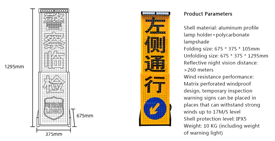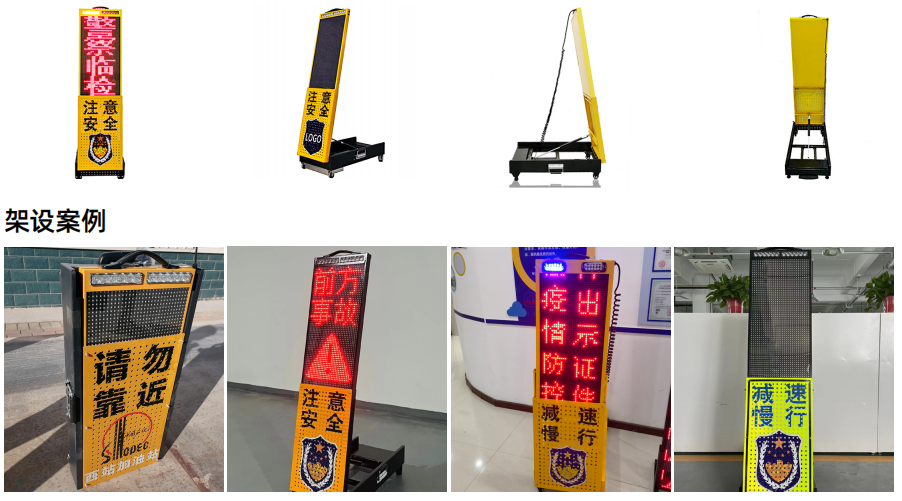 It is a safety warning and protection device that integrates warning lights, LED display screens, warning signs, alarms, and voice playback. The alarm and text message prompt can be synchronized for long visual distance and good warning effect. Effectively provide real-time traffic information prompts, warnings, and other functions, while improving the safe driving of vehicles on the road. Mainly used for warning of police inspection accidents and construction sites. The bottom is equipped with pulleys for easy movement and carrying.