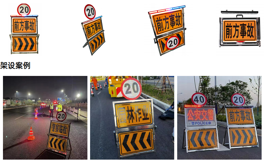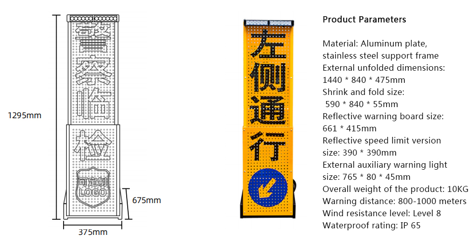 Mainly used for temporary road management, in road traffic law enforcement and emergency response at accident sites, as a warning sign placed on the side of the road to warn vehicles to slow down and slowly pass through the accident site or stop. The warning sign displays high brightness reflective characters and warning symbols, with a visible distance of over 300 meters during driving. It is also suitable for use in poor weather conditions and at night. The matching high brightness red and blue flashing warning lights have a more obvious night warning effect. The two directional signs are separate entities that can be freely flipped and quickly disassembled. The content combination of the directional signs is diverse, which can meet different warning needs. Featuring a unique design, it can be quickly unfolded and stored during use, and can be easily placed in the car trunk after storage.