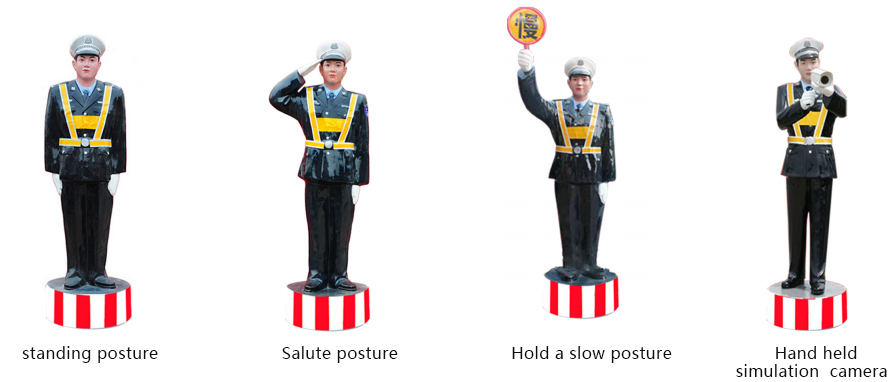 Simulated police ", also known as" simulated police "or" simulated traffic police ", is composed of a human body model and the standard police uniform of China. It is made of fiberglass commonly used in aviation and aerospace, which is lightweight, high-strength, and not afraid of oil, water, fire, wind, sun, and durability. At the same time, to meet the needs of different scenarios, there are various postures: standing, saluting, holding slow text, and holding hands to simulate the camera; There is one more step and two more steps. It is mainly placed in suburban, county, and high-risk highway accident prone areas to remind drivers to follow rules and regulations and drive safely, thereby achieving the goal of reducing traffic accidents. Simulated police can fill the gaps in police presence along highways.