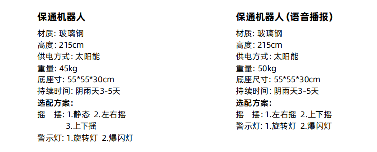 太阳能保通机器人,包括底座以及塑料人体,塑料人体内部设有驱动结构,驱动结构包括支架,驱动电机,凸轮,滑块,,一对连杆 一对安装块,一对转动杆;一对连杆的底部分别与滑块顶部相连,其顶部分别与一对安装块转动连接,一对安装块固定于一对转动 杆上;一对转动杆分别与支架转动连接,两个手臂分别与一对转动杆的外侧端相连,驱动电机安装于支架,支架上设有竖直滑轨, 凸轮位于滑块下方并与滑块配合;驱动电机使凸轮旋转,凸轮带动滑块沿支架的竖直滑轨间歇性地上下运动,从而通过连杆带动 转动杆转动,最终使手臂挥动彩旗。多用于施工路段指挥,警示。