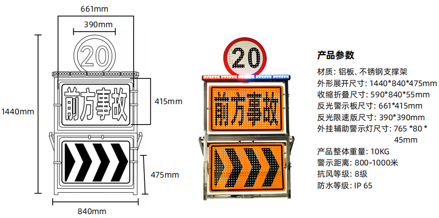 主要用于路面临时管理,在道路交通执法及事故现场应急使用,作为预警标志置于道路侧方,提前警示车辆减速,缓慢通过事故现场或停车。警戒牌上显示高亮度反光字符及警示符号,行车状态中可视距离可达300米以上,也适合气象不佳及夜晚使用。配套的高亮度红蓝爆闪警示灯,夜间预警效果更明显。两款导向牌为单独个体,可自由翻转、快捷拆卸,导向牌内容组合多样化,可满足不同预警需求。具备独特设计,使用时可快速展开与收纳,收纳后可轻松放入汽车后备箱。